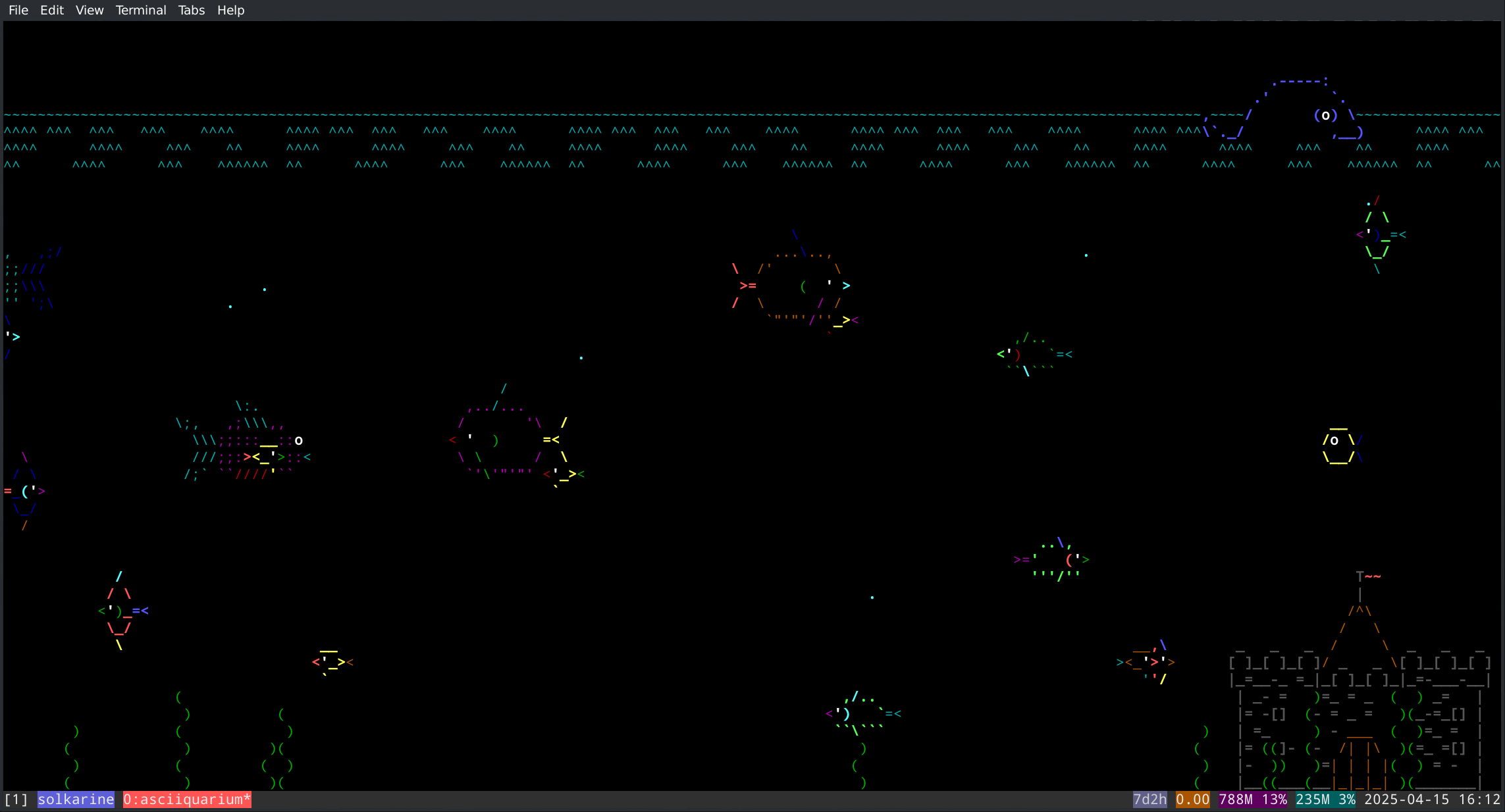 Cet outil simule un économiseur d'écran d'un des thèmes les plus célèbres, celui de l'aquarium virtuel. Entièrement en mode texte, à lancer directement dans un terminal par la commande :asciiquarium