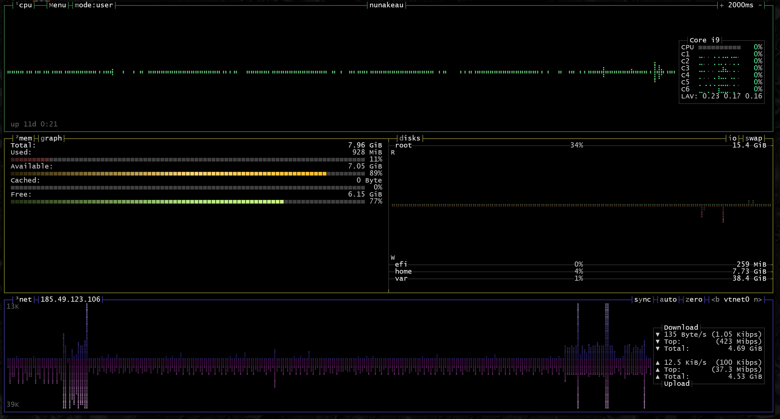 Je vous présente donc btop un dashboard complet vous permettant non seulement d'observer le trafic réseau, mais aussi le reste de votre système : charge CPU, processus, I/O disques et mémoire. Tout en un, personnalisable (vous pouvez choisir les éléments à afficher) et entièrement en mode texte.