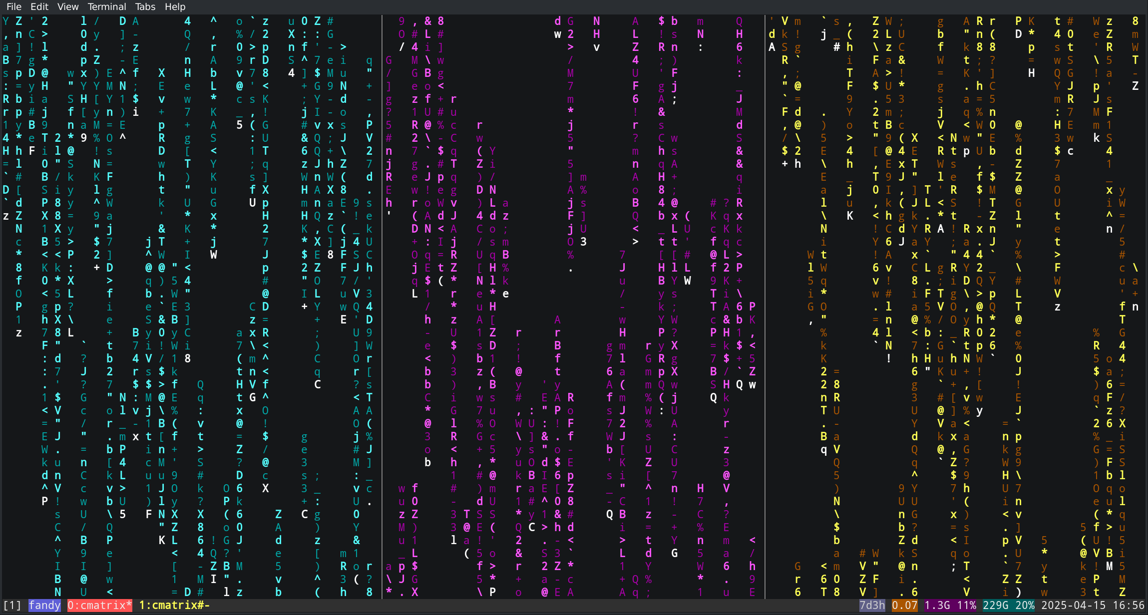 Si vous utilisez tmux (ce que je vous recommande), vous pouvez faire quelques setups rigolos. Dans les trois terminaux de la seconde capture, les commandes lancées sont, de gauche à droite :Le logiciel est surtout disponible pour Linux. Je n'ai malheureusement pas vu de package pour les systèmes *BSD.cmatrix -a -b -C cyan cmatrix -a -b -C magenta cmatrix -a -b -C yellow