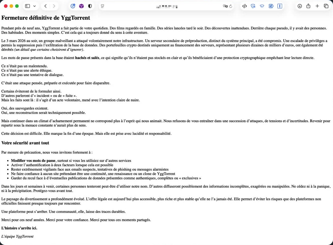 Communiqué officiel de l'équipe YggTorrent – Cliquez pour afficher