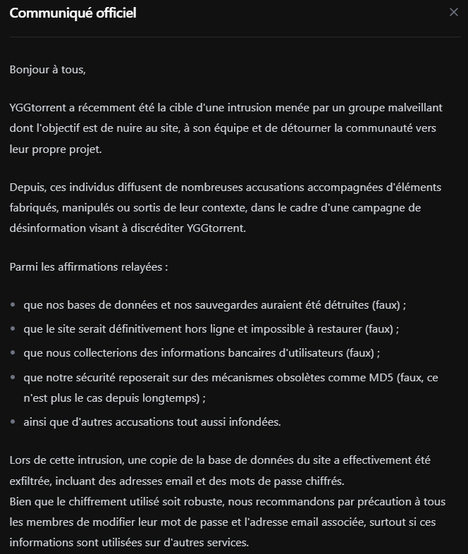 [ Un résumé de la manière dont YggTorrent a été piraté est disponible sur la page principale. ]